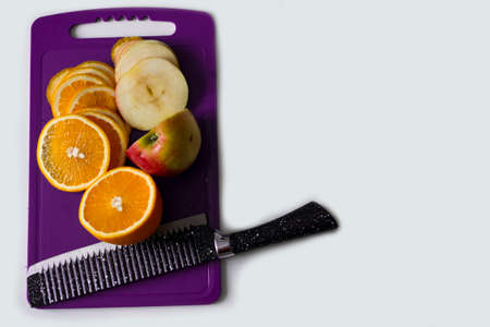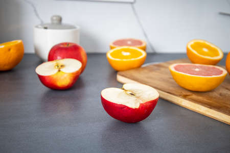 Fruits orange, apples cut in half on a wooden board on a gray background.