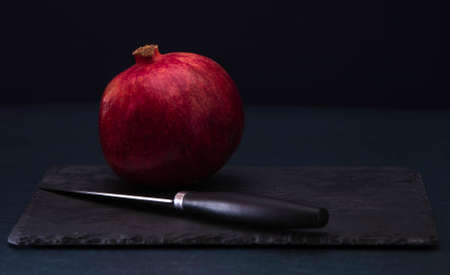 Ripe red pomegranates. Seasonal fruits. Royal fruit. Cutting a pomegranate. on black background