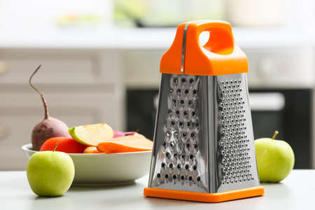 vegetable peeler and vegetable cutter on a wooden table in the kitchen close-up