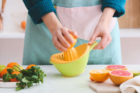 Man's hands making orange juice with a manual juicer on an old wooden background in green tones. Mediterranean diet concept