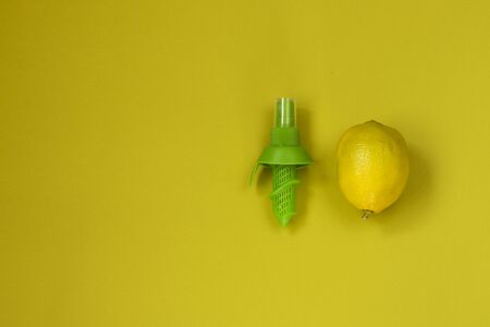 Fresh ripe juicy lemon on a olive color background. Green spray nozzle for citrus fruits. Top view with copy space. Horizontal position. Copy space.
