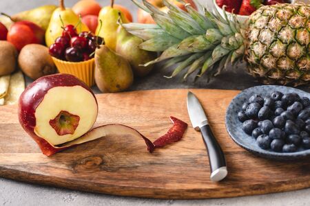 Preparing Fresh Mixed Colorful Fruit Salad on Wood Cutting Board. Diet and Healthy Eating Concept.