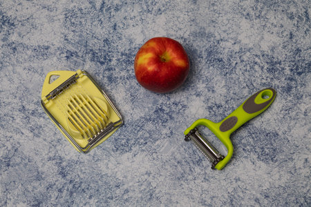 Fresh red apple placed beside a modern vegetable peeler and slicer on blue textured background. Concept of healthy eating, kitchen utensils, food preparation, and fresh ingredients for cooking at home