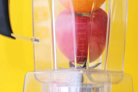 Healthy food. Apple and orange in a blender close-up. The blender knife is ready to go. Healthy eating.