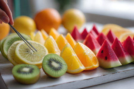 Colorful fruit slices are artistically arranged, sparkling with cheerful energy and wellness vibes, creating a refreshing atmosphere in a bright kitchen.