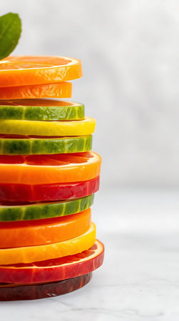 Various fruit slices are stacked vertically to form a vibrant totem display, showing a mix of colors and textures with a simple backdrop.
