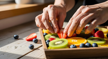 Close-up of hands meticulously arranging fresh slices of strawberry, kiwi, and orange on a wooden serving tray. The scene is illuminated by natural sunlight, emphasizing the vibrant colors and freshness of the healthy snack.