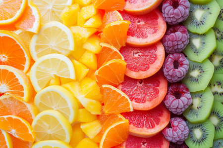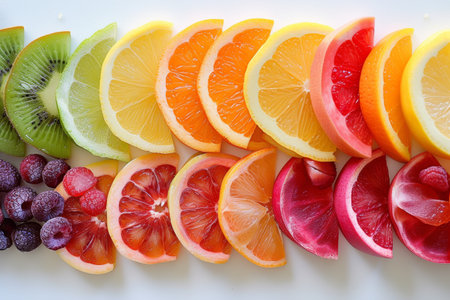 A visually appealing arrangement of vibrant and fresh fruit slices showcases the beauty of nature's bounty. Ideal for themes of nutrition, wellness, and healthy eating.