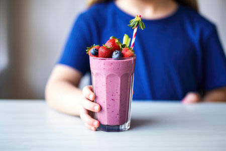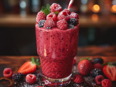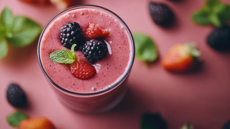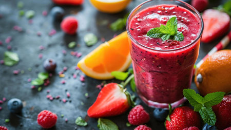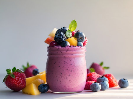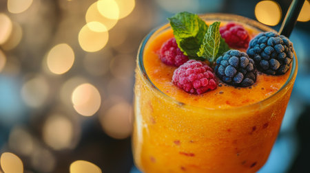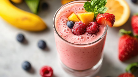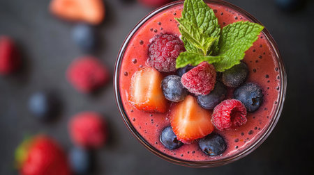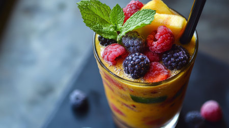 A detailed shot of a glass of vibrant fruit smoothie, topped with fresh berries and a mint sprig, showcasing the colorful and healthy ingredients.