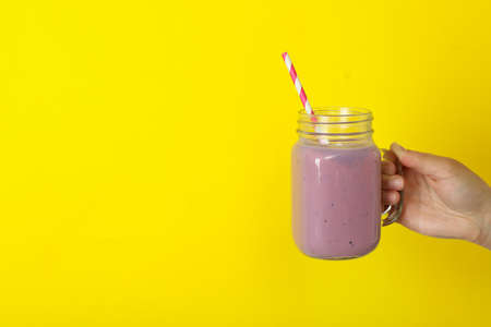 Female hand holds jar of smoothie on yellow background