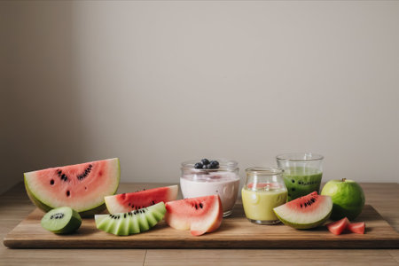 a glass of creamy yogurt placed beside an artfully arranged selection of fresh fruits. The setting exude modern minimalist aesthetics
