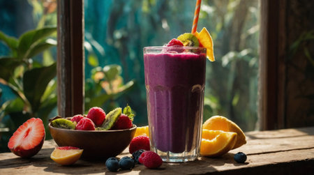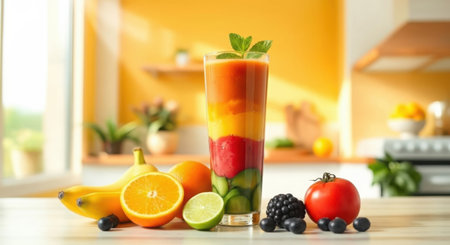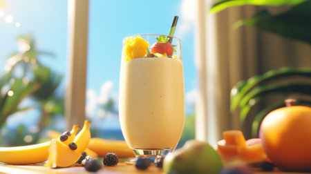 A vibrant tropical smoothie made with fresh fruits sits on a sunlit kitchen table, symbolizing health, nutrition, and pure refreshment in summer bliss.