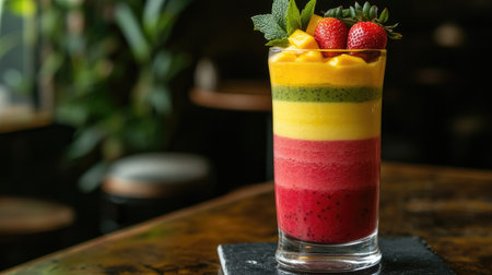 A layered fruit smoothie with vibrant colors, including strawberry, banana, and mango layers, served in a tall glass with fruit garnish