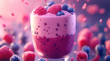 AI Generated. Colorful berry smoothie topped with fresh fruit and a mint leaf