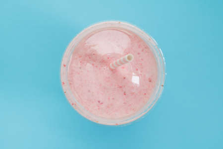 Top view of a strawberry smoothie in a plastic cup with a straw on a blue background. Pastel color. Summer and healthy lifestyle concept.
