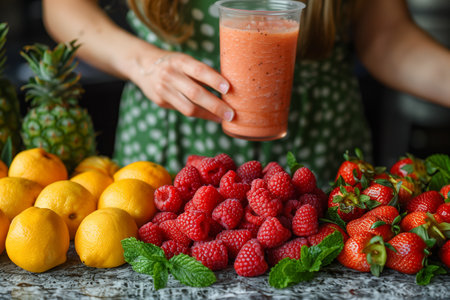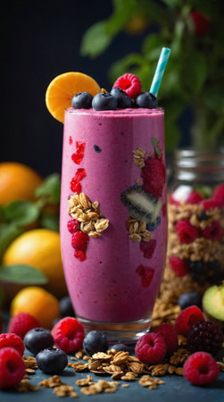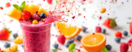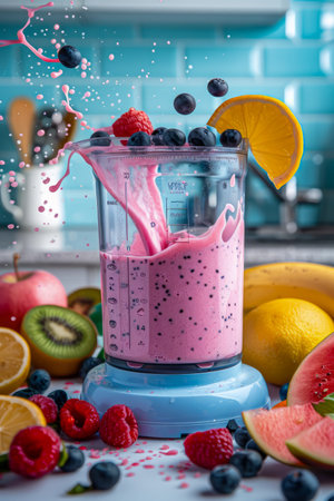 A delightful arrangement features a smoothie brimming with berries and citrus, splashing joyfully. Surrounding it, fresh fruits add a burst of color, igniting appetites with their sweetness.