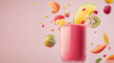 Bright and refreshing smoothie splashes with assorted fruits in a clear glass against a pastel background