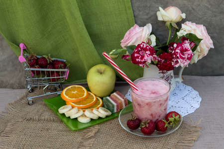 On the table is a bouquet of roses, a supermarket trolley with strawberries, a glass with strawberry dessert. On a plate are sliced banana and orange, apple and marmalade.