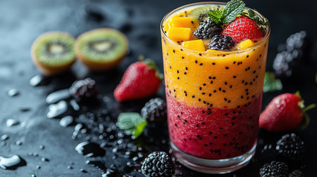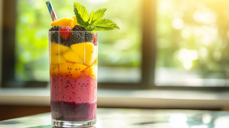 A vibrant fruit smoothie featuring layers of mango, berries, and mint leaves, perfect for a refreshing treat in sunny settings. Ideal for health enthusiasts.