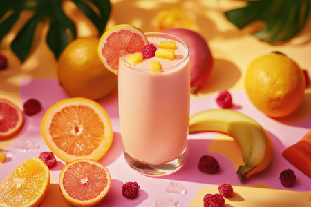 A refreshing tropical smoothie with fruits, vibrant natural light, and pastel tones