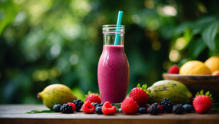 AI Generated. Berries smoothie in a bottle on the table and several tropical fruits on the table on green nature background