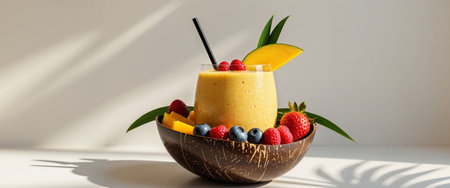 AI Generated. Tropical Mango Smoothie with Berries in Coconut Bowl