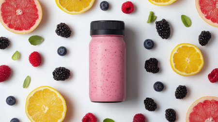A vibrant pink smoothie sits in a jar, surrounded by fresh citrus fruits and berries. This healthy beverage is perfect for a refreshing snack or breakfast option.