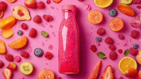 A fresh smoothie bottle with vibrant fruit liquid dispersions on a bold magenta background.