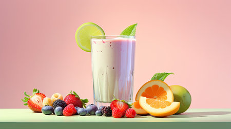 Smoothie Glass. A glass filled with fresh smoothie with fruits on the side, isolated on a Pastel