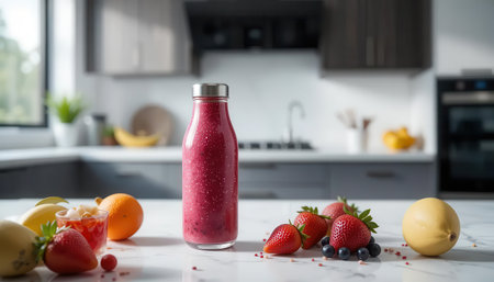 A vibrant glass bottle filled with a fresh berry smoothie sits amid a variety of colorful fruits, showcasing a healthy and delicious drink option perfect for any kitchen.