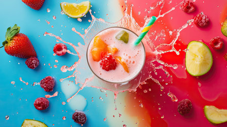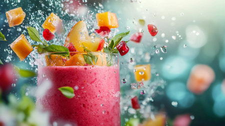 A vibrant smoothie delights the feelings as fresh fruit pieces burst above a glass. The vivid colors create an inviting and refreshing atmosphere, perfect for a summer day.