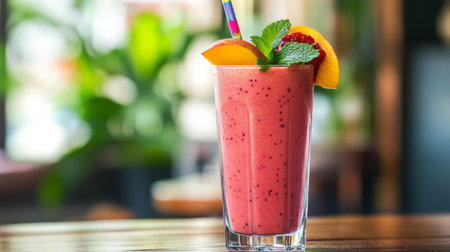 A vibrant smoothie in a tall glass garnished with fresh fruit slices and mint leaves, served with a colorful straw and set on a stylish wooden table.