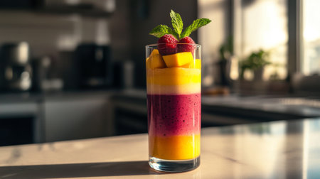 A refreshing layered fruit smoothie made with mango and raspberry in a clear glass. Bright kitchen setting with sunlight highlights the vibrant colors.