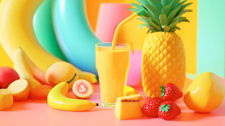 Colorful fruit arrangement featuring a glass of yellow drink beside a pineapple, strawberries, and bananas. Perfect for summer vibes and vibrant designs.