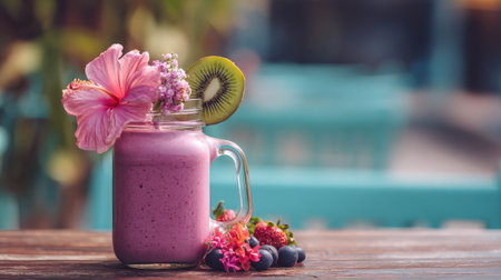 A beautifully arranged fruit smoothie in a mason jar, decorated with a hibiscus flower, kiwi slice, and fresh berries, perfect for summer refreshment.