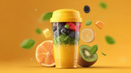 A colorful smoothie filled with fresh fruits and greens in a yellow cup, surrounded by vibrant slices of citrus and berries, creating an energizing summer vibe.