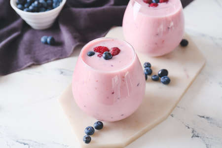 Glasses of tasty smoothie with blueberry and raspberry on light background