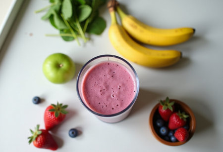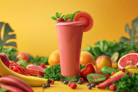 Healthy Smoothie and Ingredients Showcasing a glass of vibrant smoothie surrounded by fresh fruits and vegetables
