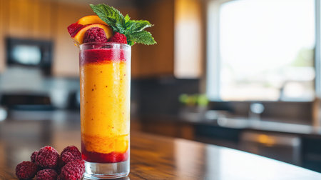 A refreshing fruit smoothie featuring layers of raspberry and peach, garnished with mint, served in a tall glass on a stylish kitchen counter.