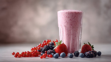 A vibrant and refreshing berry smoothie made with assorted fruits, displayed in a glass on a grey background, perfect for health-conscious individuals.