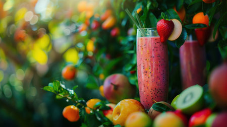 A tall glass filled with a vibrant pink smoothie sits amidst a vibrant garden scene. The smoothie is topped with a fresh strawberry and a few leaves of greenery. The background is filled with various fruits, including oranges, apples, and mangoes. The glass sits on a table, surrounded by the lush foliage of the garden.