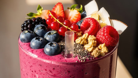 A close-up shot presents a vibrant smoothie bowl, brimming with a mix of fresh berries, including blueberries, raspberries, and strawberries. The composition showcases a variety of colors and textures, enhanced by the natural lighting. This image is suitable for culinary, health, and wellness content.