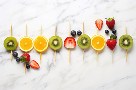 Vibrant fruit skewers arranged on a marble surface, showcasing a mix of colorful fruits like kiwi, strawberry, blueberry, and banana, perfect for healthy snacking.