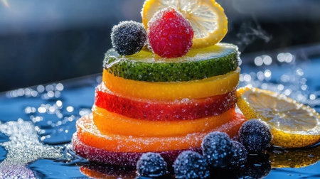A visually stunning arrangement of colorful fruit slices stacked with water droplets, featuring fresh citrus accents and a gloss finish. Perfect for vibrant presentations.