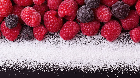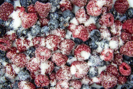 A Berry mix in sugar from frozen raspberries and blueberries. A Frozen Berries with Sugar. A sweet background with frozen raspberries and blueberries. Sugar Berries in the background. A heathy berry