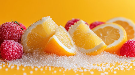 Juicy lemon slices and vibrant raspberries are scattered on a cheerful yellow surface enhanced with a sprinkle of sugar crystals.