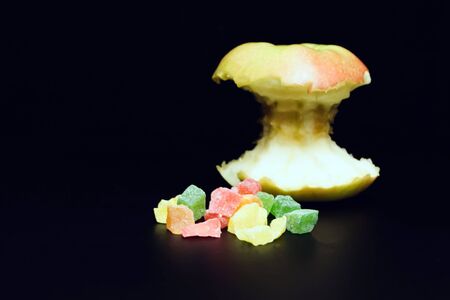 Gummy jelly bears, chewing fruit candies and refined sweet sugar piles. Consumprion and addiction. High quality photo