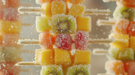 Vivid and delightful fruit skewers coated in sugar for a sweet treat. Perfect for summer parties, catering events, or healthy snacking options.