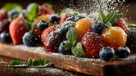A close-up shot of a wooden board laden with fresh strawberries, blueberries, cantaloupe, and mint, delicately dusted with powdered sugar.