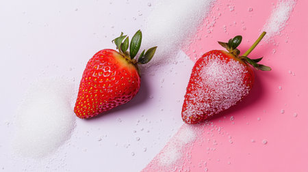 Two ripe strawberries coated in sugar are elegantly arranged on a pastel background, showcasing their vibrant colors and textures for enticing visual appeal.